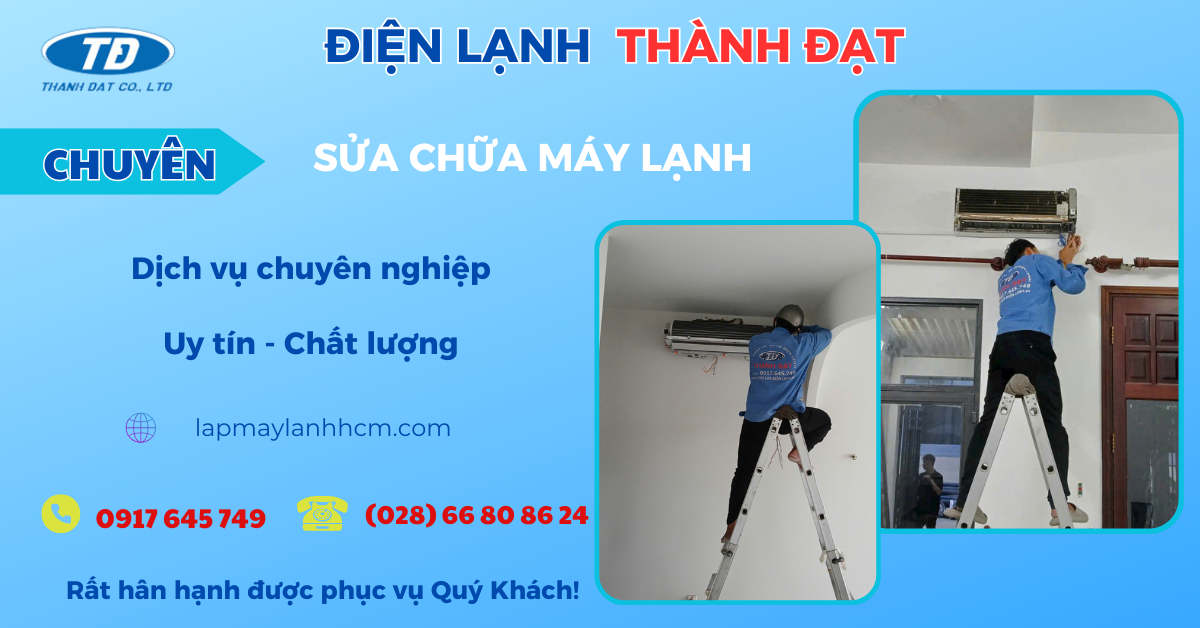 Công Ty Điện Lạnh Thành Đạt là đơn vị chuyên cung cấp dịch vụ sửa chữa máy lạnh uy tín tại TPHCM. Chúng tôi tự hào là sự lựa chọn hàng đầu của khách hàng trên thị trường hiện nay. Cùng với đội ngũ kỹ thuật viên được trang bị đủ những thiết bị cần thiết. Cam kết thực hiện thao tác chính xác, thời gian sửa chữa nhanh chóng. Mời quý khách hảng gọi ngay qua hotline 0917 645 749 để được tư vấn miễn phí về dịch vụ sửa chữa máy lạnh.